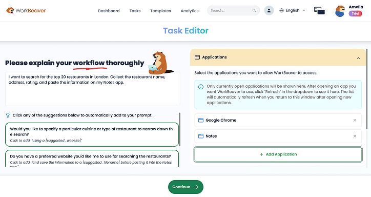 Tell WorkBeaver what you want it to do and grant access to any apps it needs to use. Not sure what to say? Use the Prompt Assist below, it’ll guide you if you forget anything.